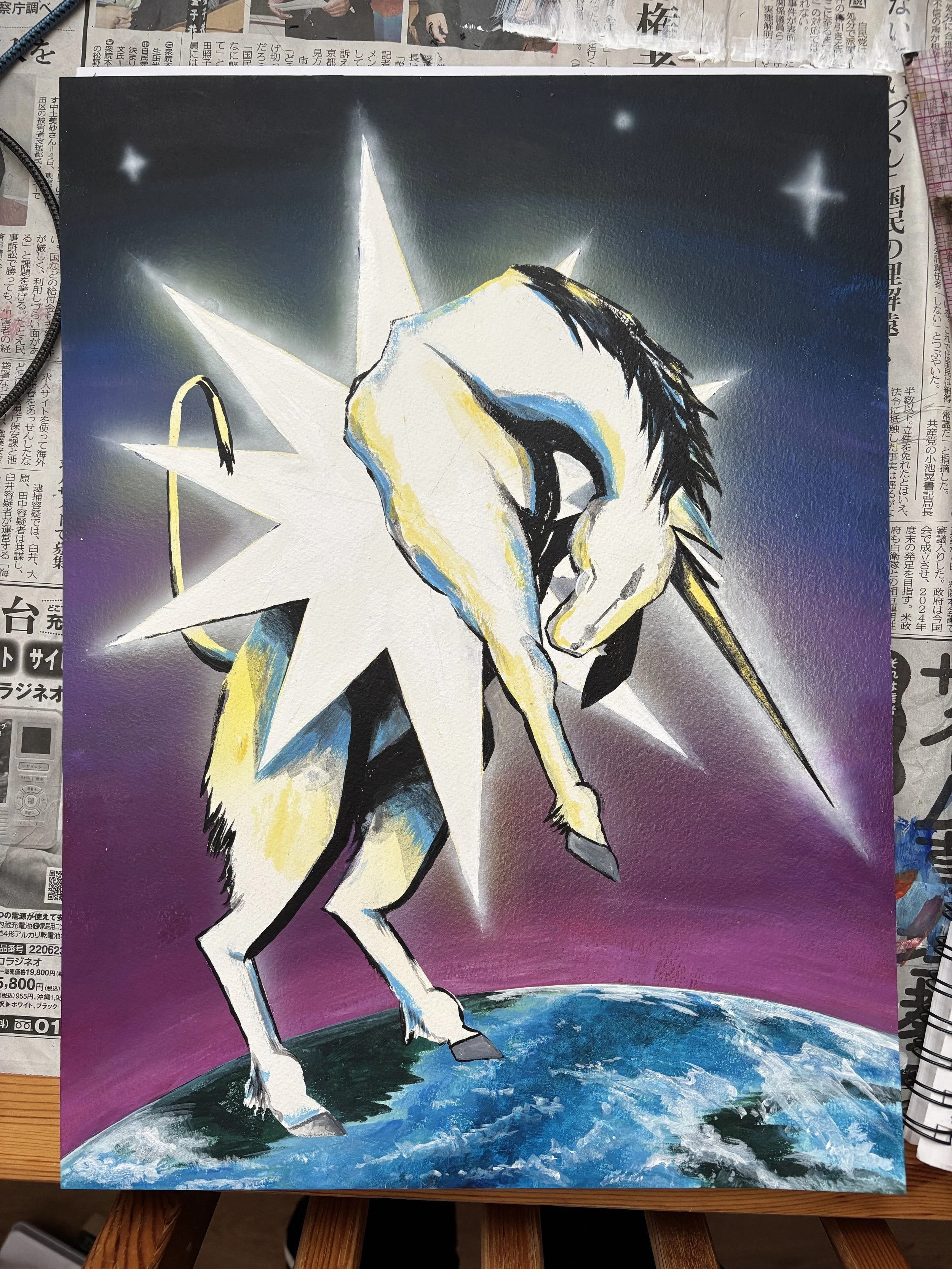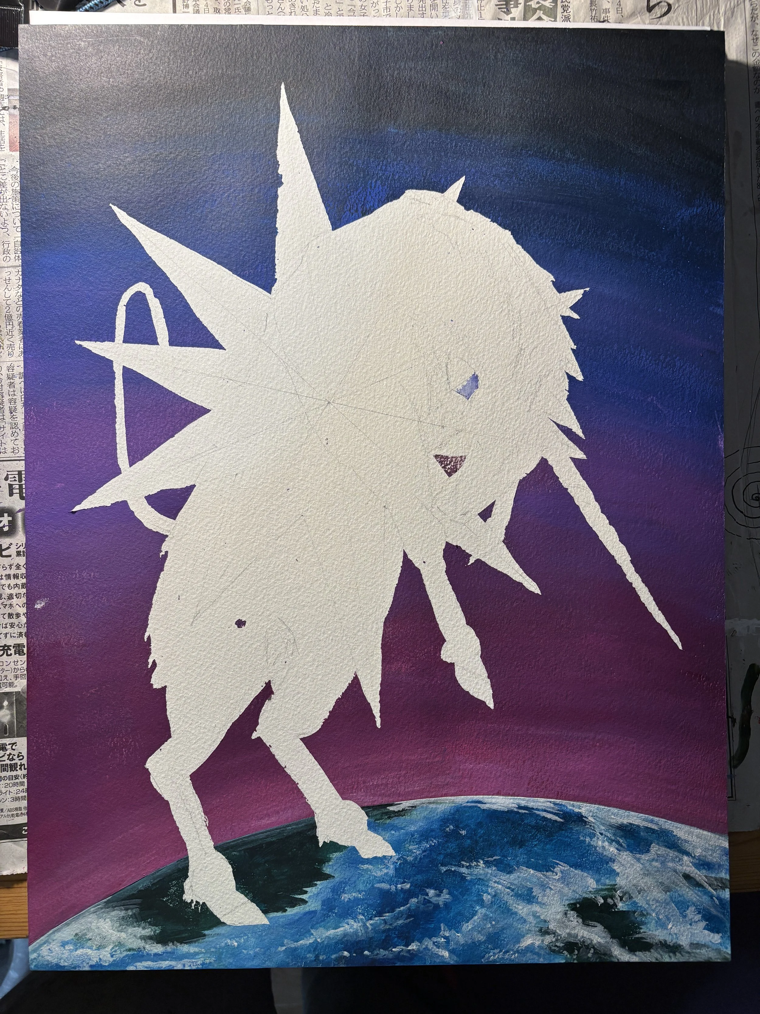 My first time pairing masking fluid with acrylic, and airbrushed light bringing the piece to life.