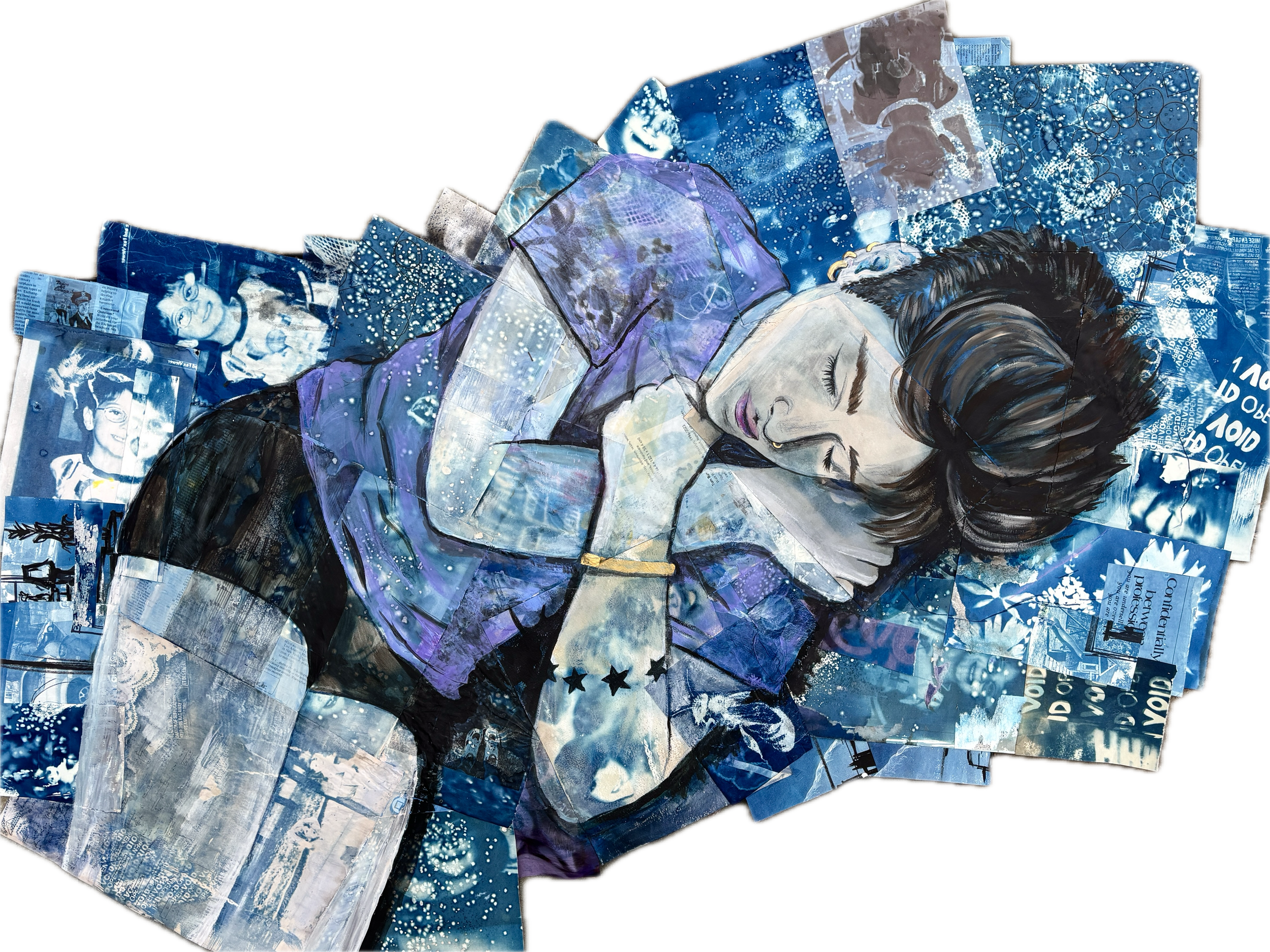 Jak, 2024. Colored pencil, acrylic paint, ink and airbrush on glued cyanotype prints. Exposed family photo negatives of Jak and their siblings and an insect, void stickers, salt, flora, gauze, twine, chains, and recycled materials. 35 x 48 inches.