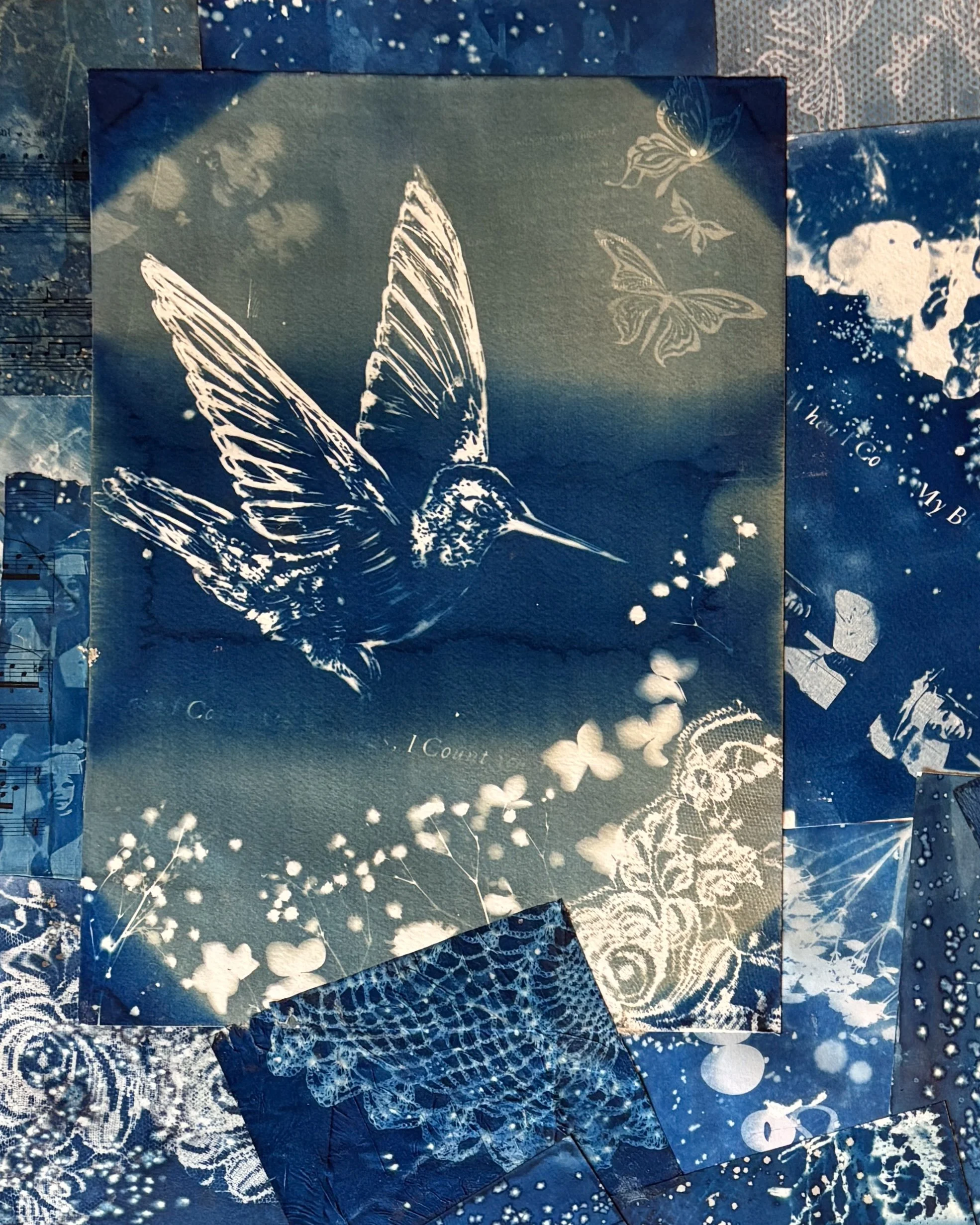 Maria, 2023. Colored pencil, acrylic paint, ink and airbrush on collaged cyanotype prints. 3 x 4 ft.