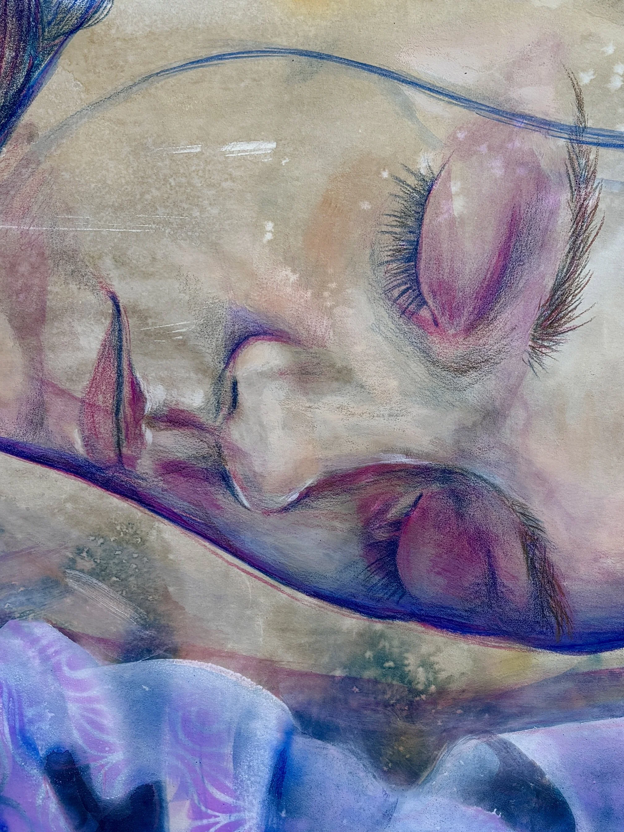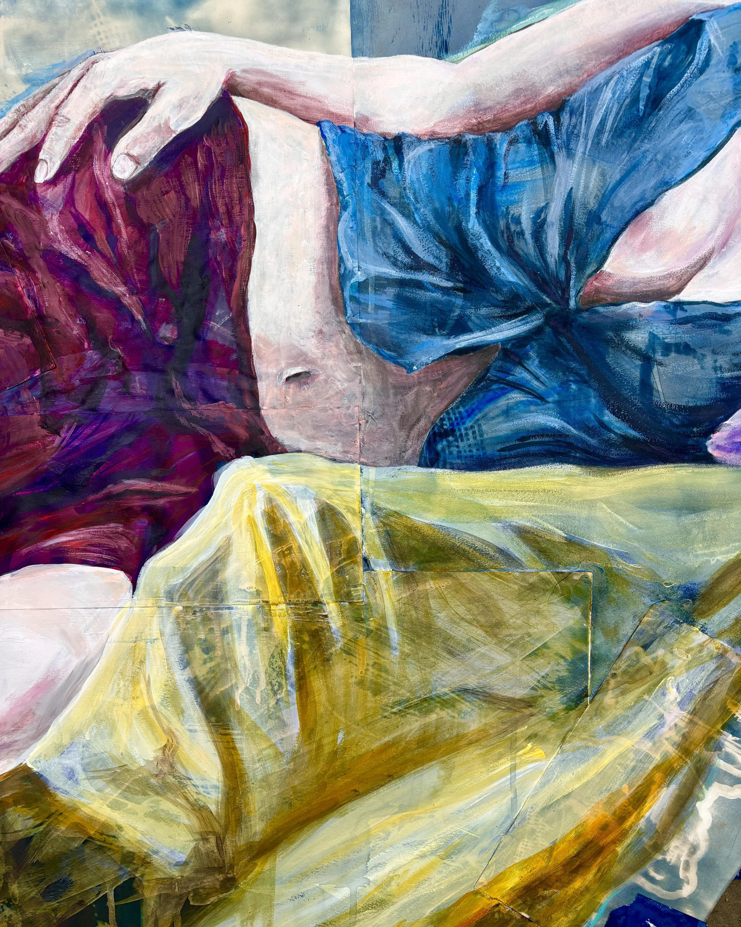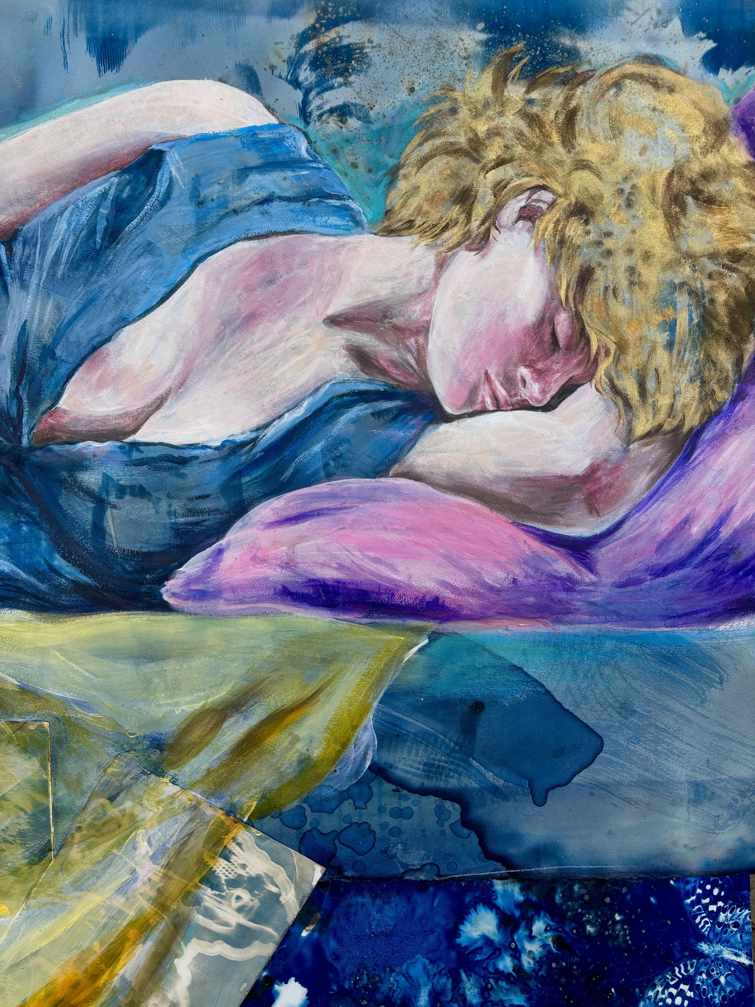 Her layered approach makes each work a visual puzzle. From a distance, each painting is one large sleeping figure. Up close, the viewer discovers she is made up of a hundred little secrets: family photographs, exposed plants and objects, the model’s handwriting, textures from lace and netting, airbrushed patterns and more. Maria captures the complexity of being, the totality behind acceptance, and the power of rest.