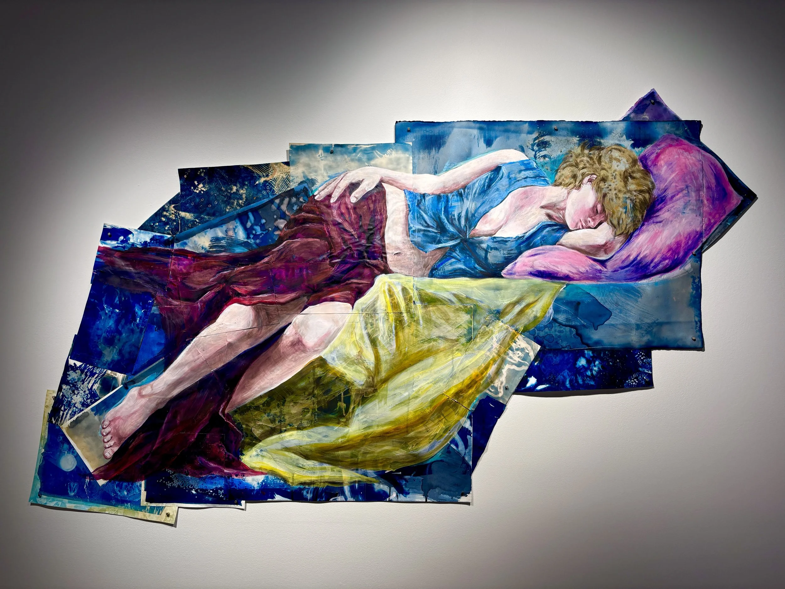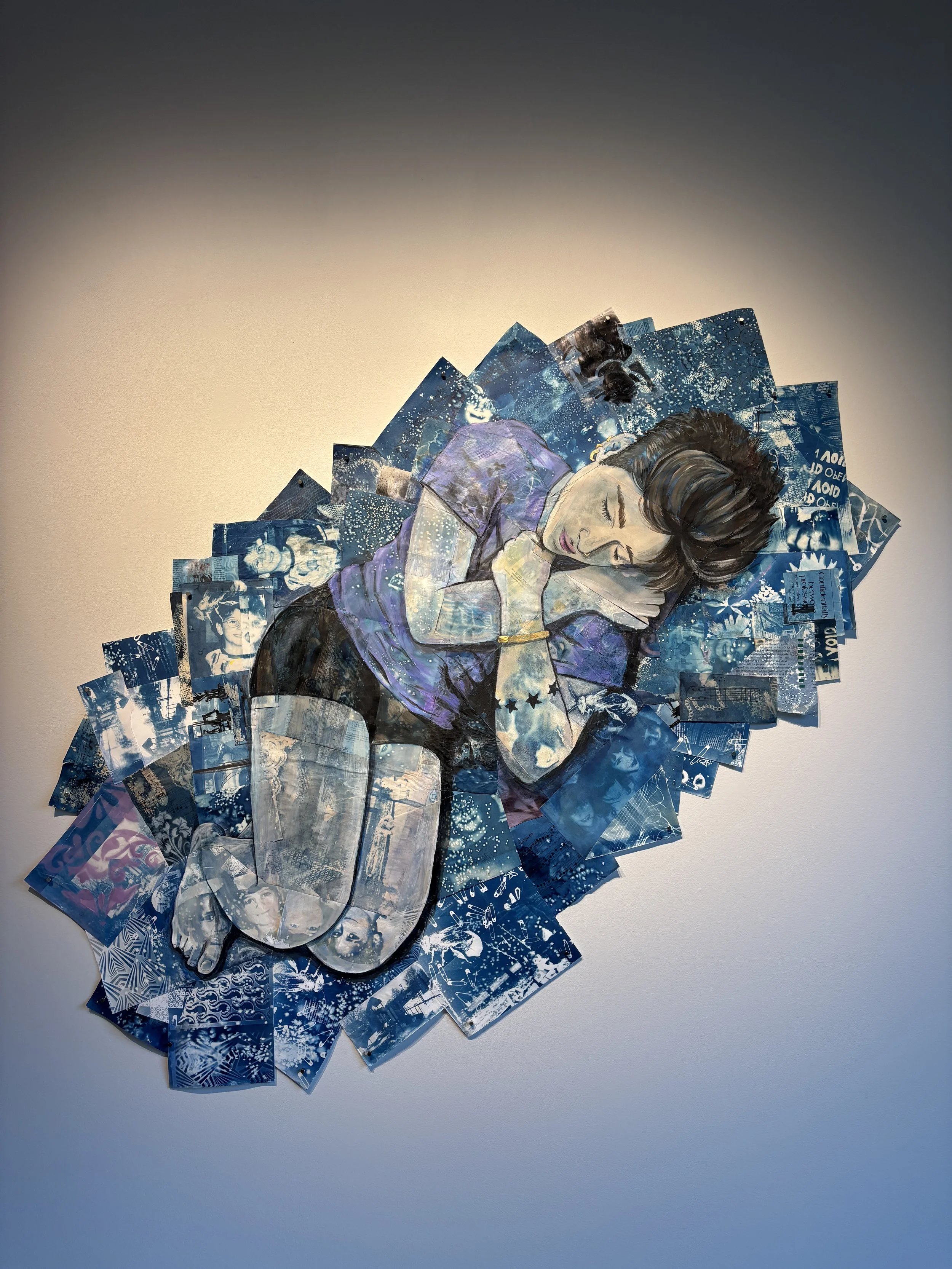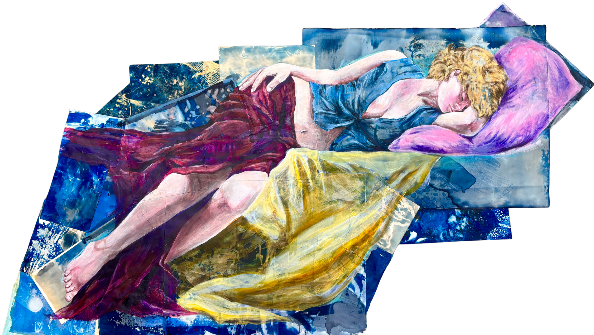 Elena, 2023. Acrylic paint, ink and airbrush on collaged cyanotype prints. 4 x 2.5 ft.