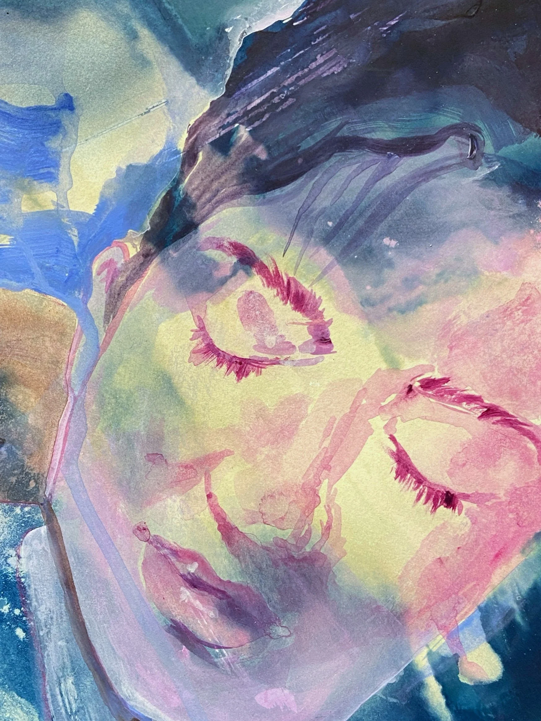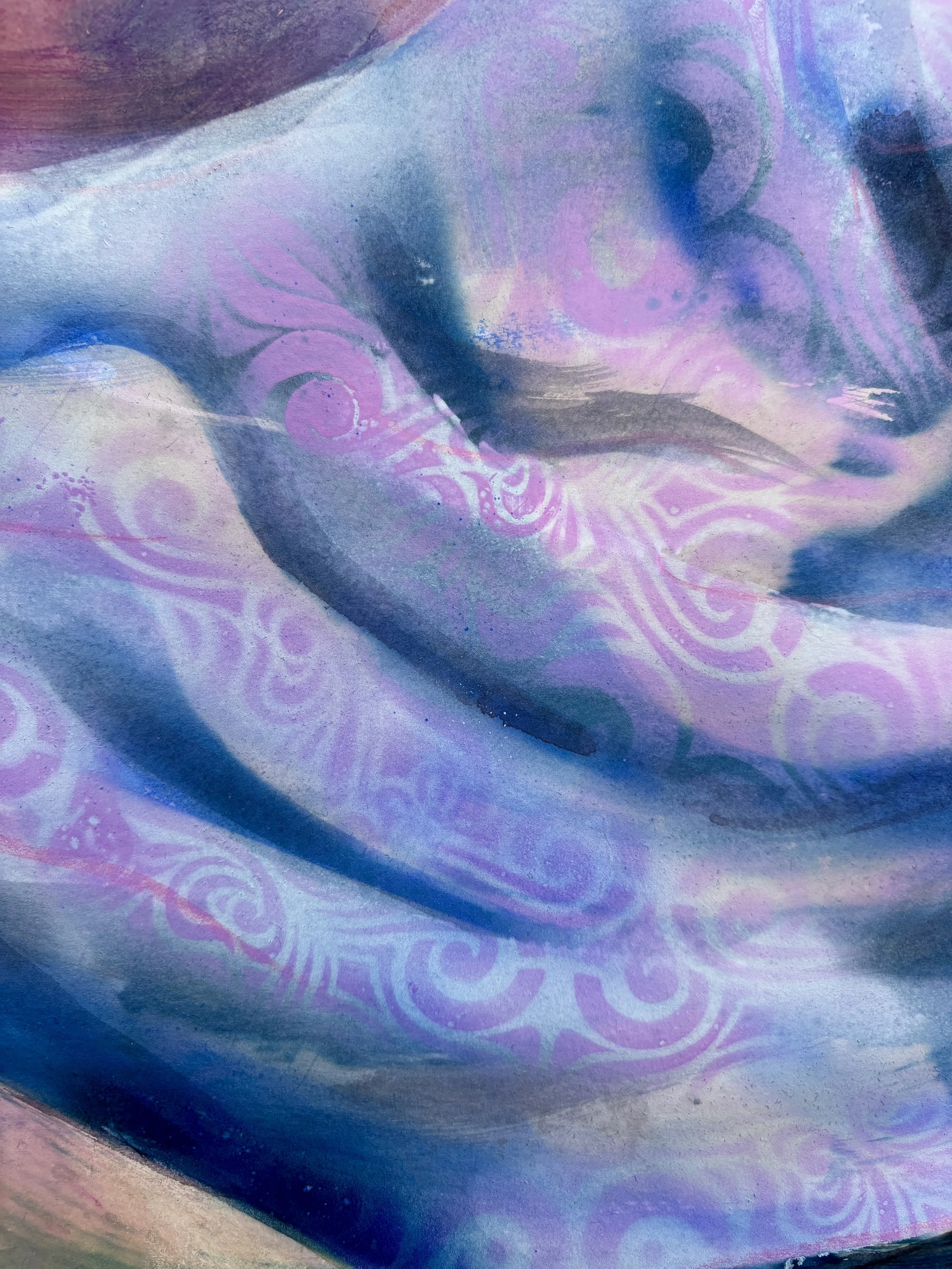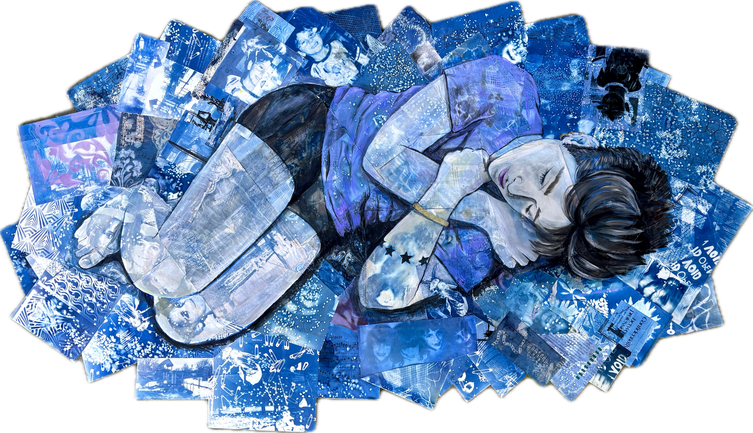 Elena, 2023. Acrylic paint, ink and airbrush on collaged cyanotype prints. 4 x 2.5 ft.