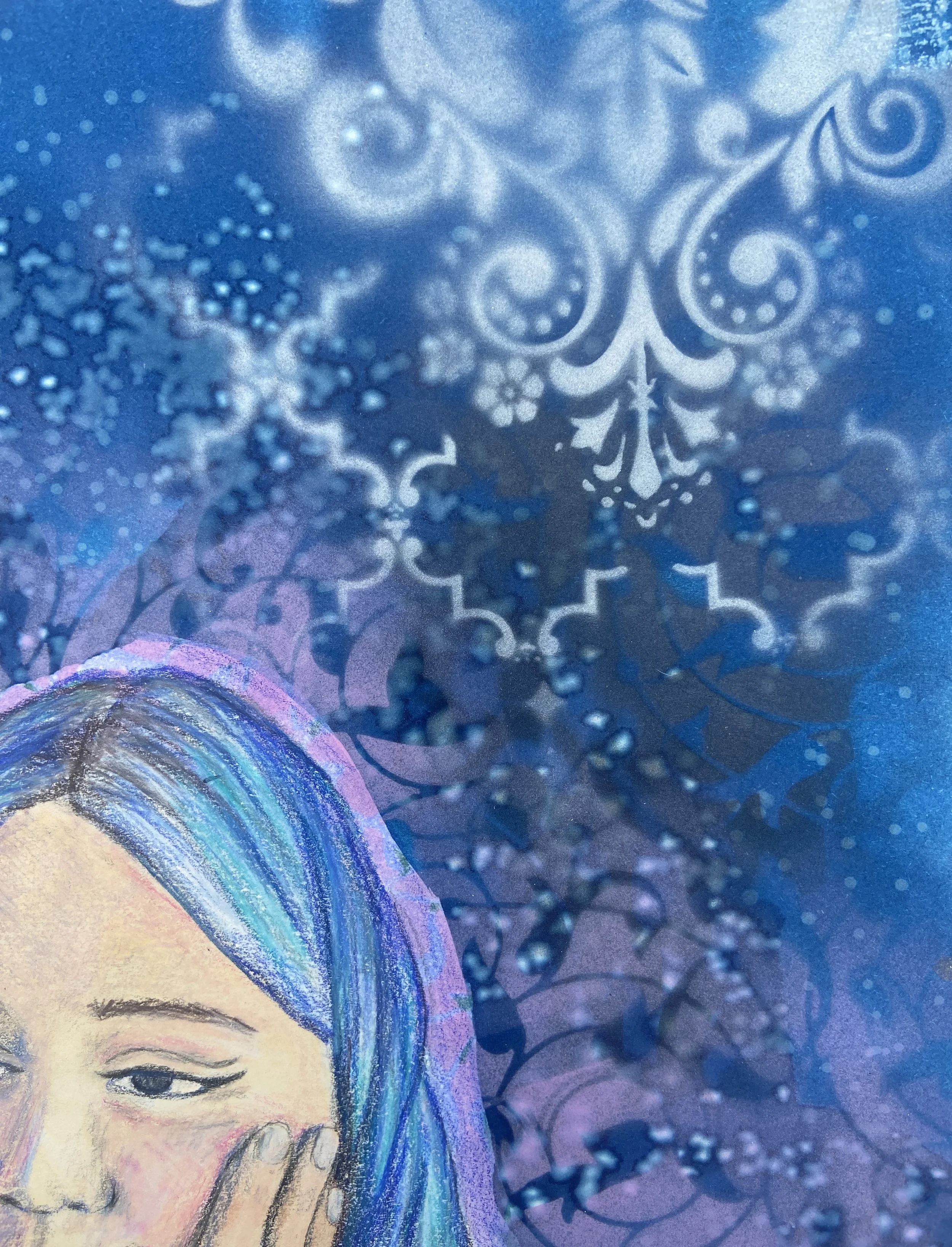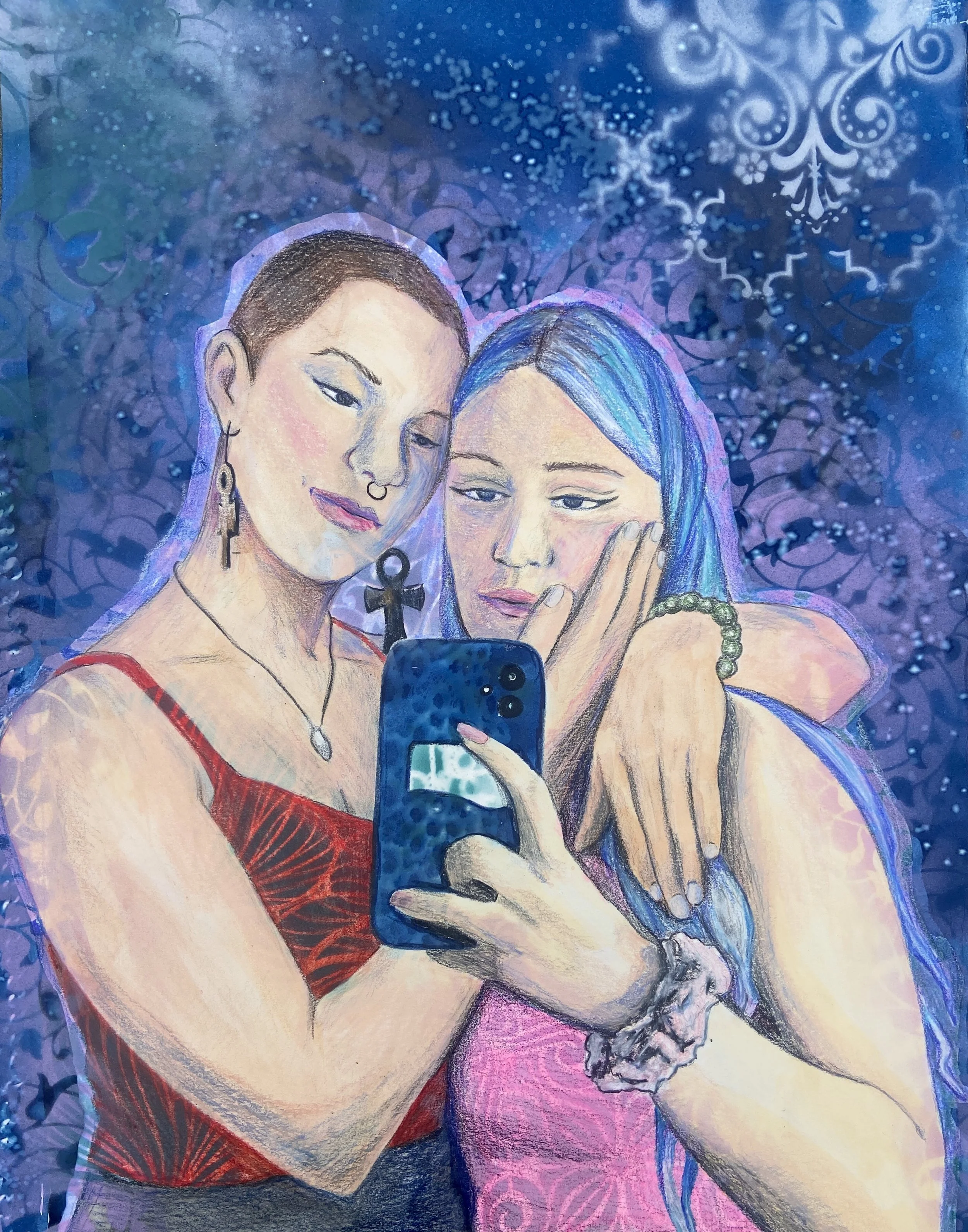 Andi and Masha, 2024. Colored pencil and airbrush on cyanotype print. Exposed chain and salt. 12 x 9 inches.