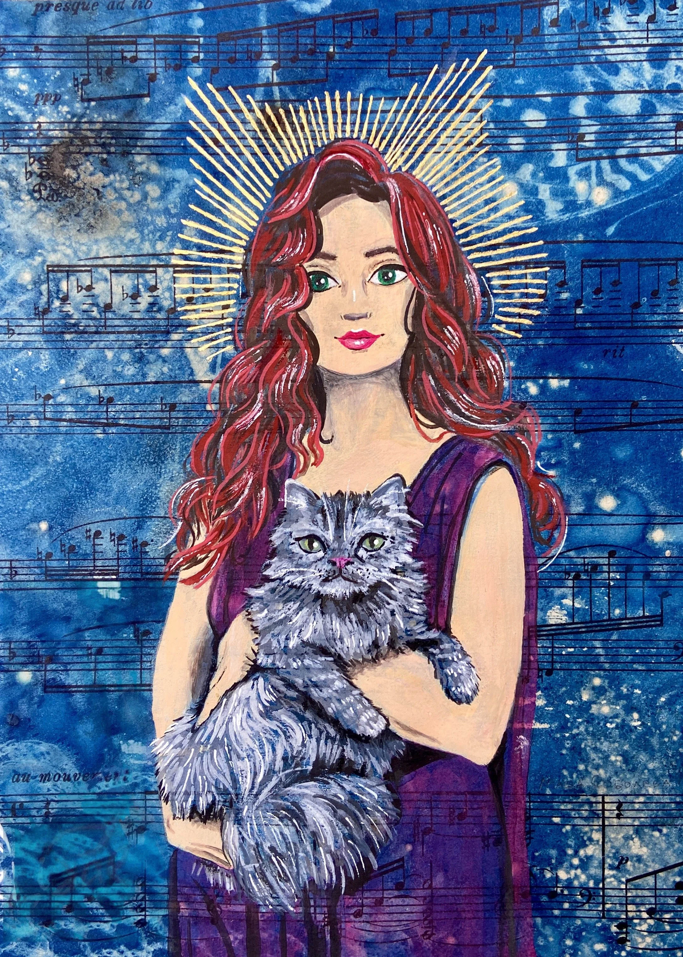 Cat Goddess, 2024. Gouache paint and acrylic gold paint on cyanotype print made with music paper. Exposed doilee, babys breath, salt and coffee toning. 7 x 5 inches.