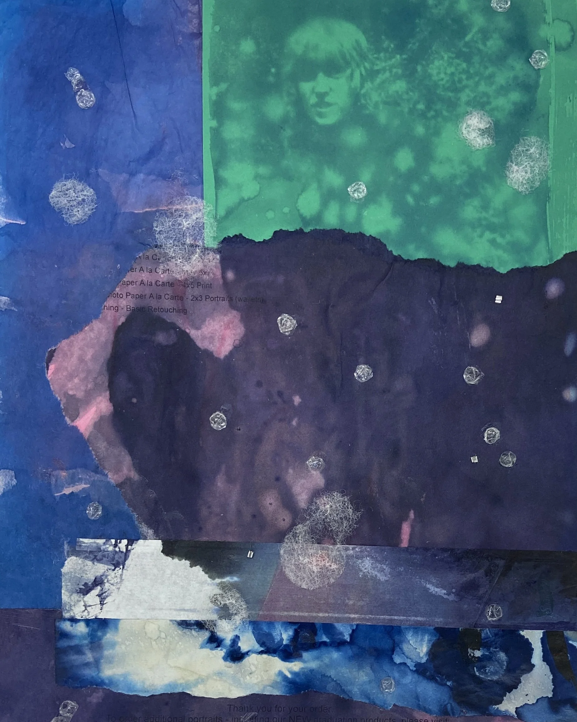 Exposed doily, tinsel and photo negative of Anna, Maria and her grandmother. Airbrush on cyanotype print.