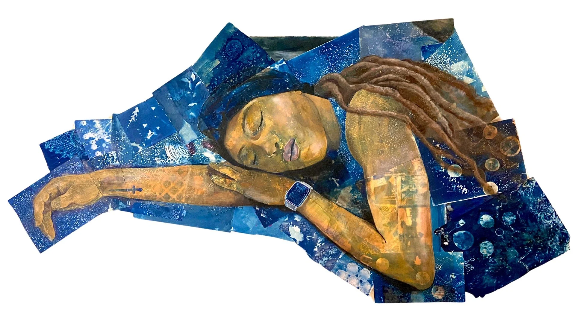 The fourth portrait in my Rest Series is based on my beautiful friend Shamari who works full-time in conservation work and part time as a teacher. She is a joy to be around and full of boundless energy, despite her never-ending work. I have never seen her sleep so I am manifesting rest for her. This larger than life painting is a work in progress. I plan to continue extending my canvas by glueing together more prints and eventually paint the whole figure from head to toe.