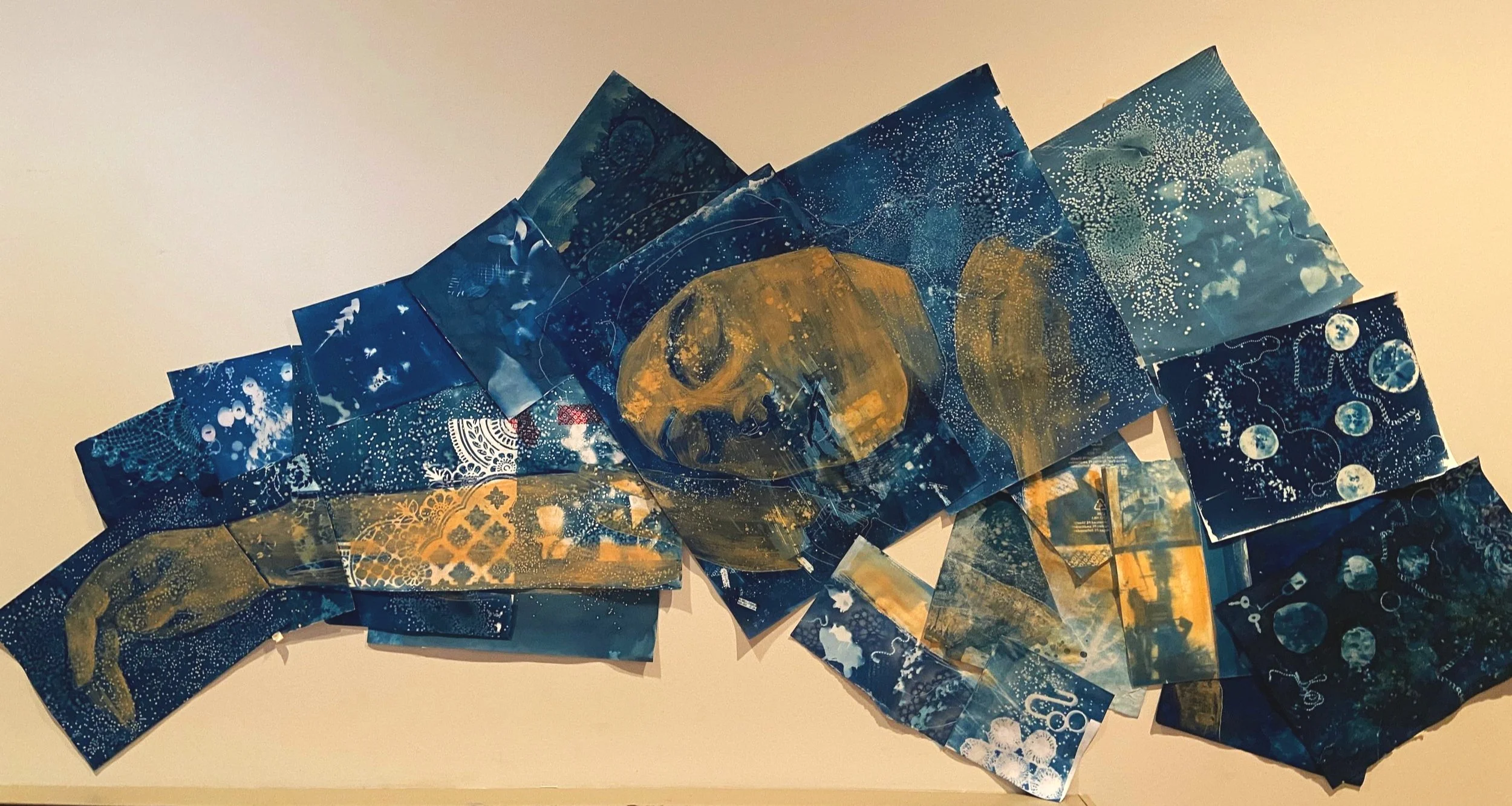 Shamari, 2024. Colored pencil, acrylic paint, and airbrush on glued cyanotype prints. Exposed family and playground photo negatives, flora, doilies, salt, beads, lock and keys, void stickers, lace, and chains. 38 x 75 inches.